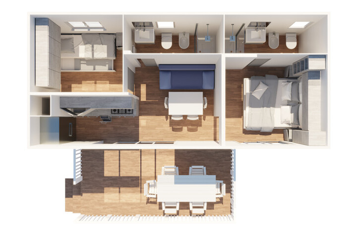 Scopri la Casa Mobile Malibu, un trilocale di 42,5 mq con veranda di 10,5 mq ideale per famiglie o gruppi fino a 5 persone. Con soggiorno con cucina attrezzata, 2 camere comode, 2 bagni, aria condizionata, TV e veranda arredata per i tuoi momenti all’aperto, offre tutto il comfort per una vacanza indimenticabile in Abruzzo.
